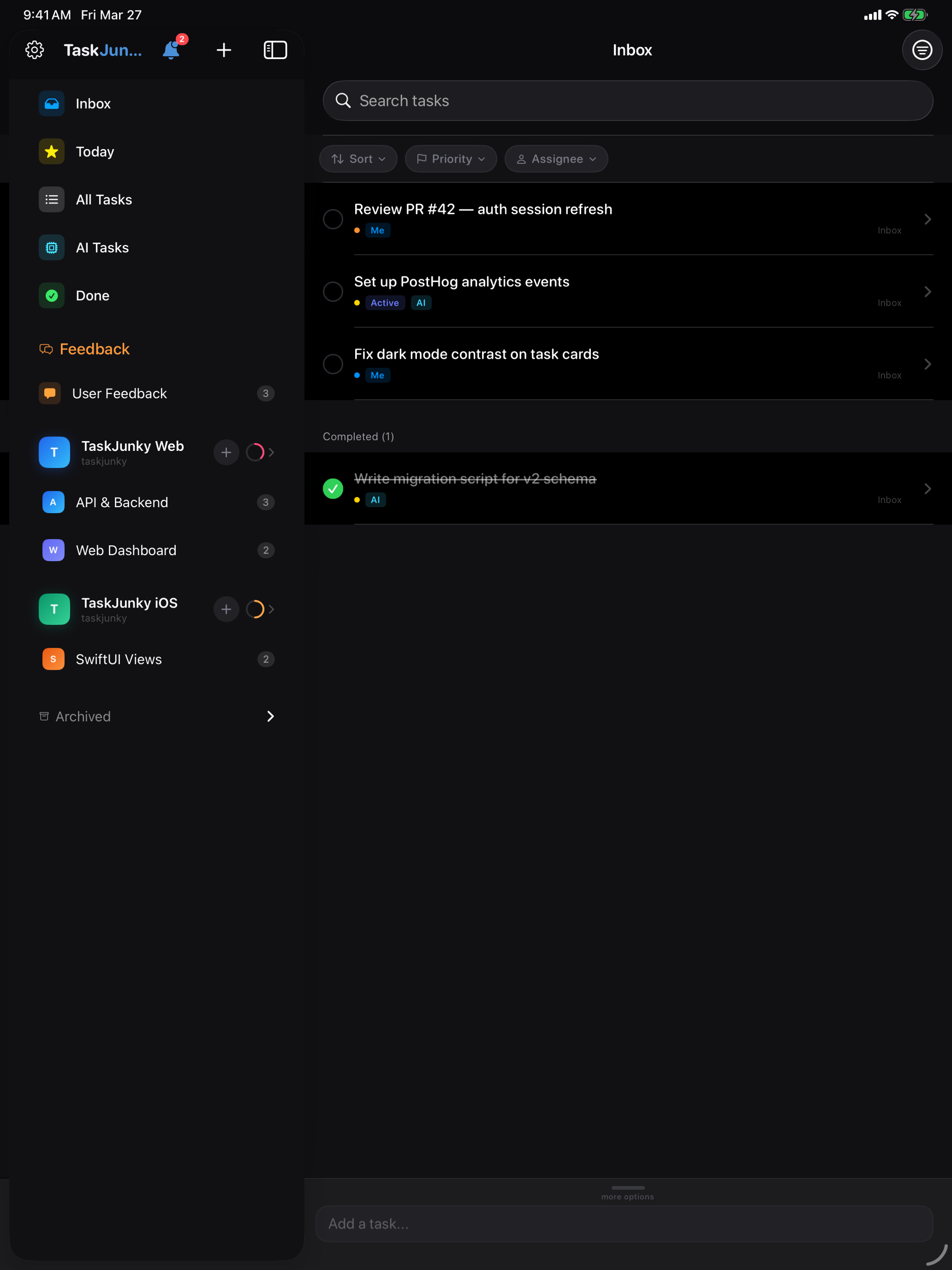 Native iOS app with swipe actions, inline editing, push notifications, and real-time sync.